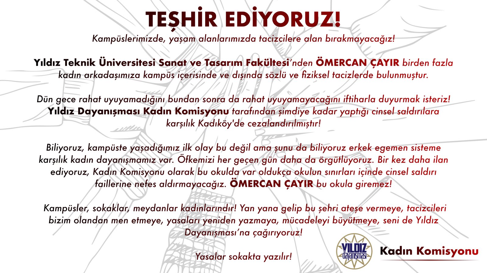 ‘Ömer Can Çayır isimli tacizci, bundan iki sene önce kampüs içerisinde bulunan birçok kadına tacizde bulunmuş, son edinilen bilgiye göre bir kadın arkadaşımızı kütüphane önünde fiziksel tacize maruz bırakmıştır. Bunun üzerine Yıldız Dayanışması bir cezalandırma süreci işletmiş ve tacizciyi Kadıköy’de döverek cezalandırmıştır. Olayın üzerinden iki sene geçtikten sonra, okula atanan kayyum rektör Eyüp Debik’in ilk icraatlarından biri, kadın mücadelesini büyütmek için emek gösteren arkadaşımıza, “tacizciye psikolojik şiddet uyguladığı” iddiasıyla soruşturma açmak oldu.